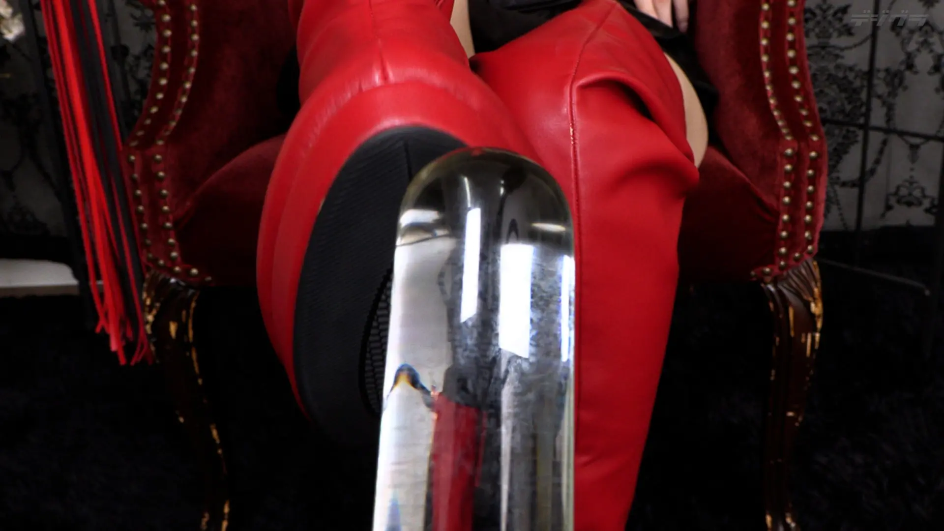真っ赤なロングブーツの先で愚息に見立てたガラス棒をツンツン、グリグリ。