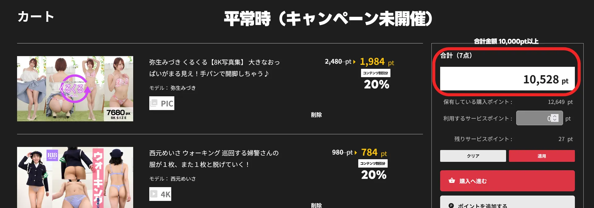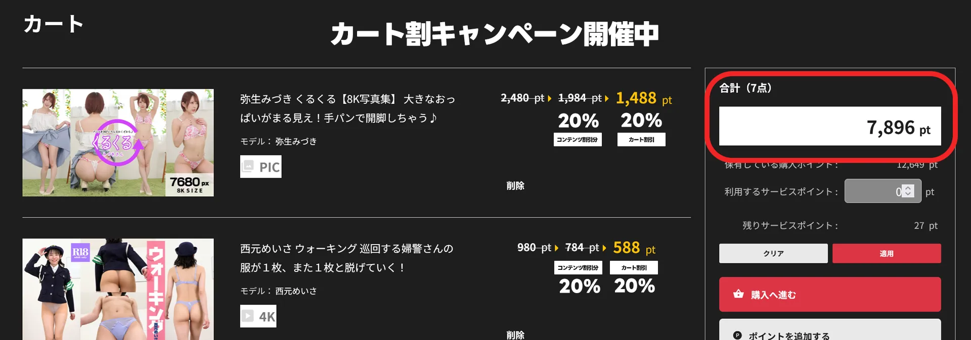 カートの合計金額によって割引が発生!コンテンツセール中の場合、コンテンツ割引額からさらに割引!SALEで50%OFF中のコンテンツが、合計金額次第で70%割引になってしまうのです。